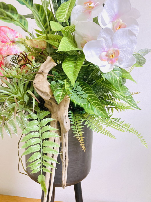 「幸せが舞い込む」花言葉を持つこの花をもっと身近に楽しんでもらえる様、鮮やかな色の胡蝶蘭と緑の濃淡が魅力的な観葉樹と「天然流木」をひと鉢に納めたアジアンテイストの作品です。人工観葉植物の『流木アート』は「衛生的」かつ「軽量」で、日当たりを気にせず、お手入れが要らないので、自由に気軽に飾って頂けます。