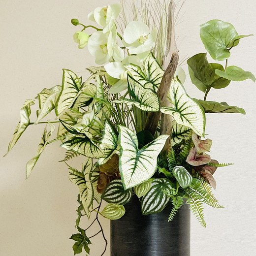 「幸せが舞い込む」花言葉を持つこの花をもっと身近に楽しんでもらえる様、鮮やかな色の胡蝶蘭と緑の濃淡が魅力的な観葉樹と「天然流木」をひと鉢に納めたアジアンテイストの作品です。人工観葉植物の『流木アート』は「衛生的」かつ「軽量」で、日当たりを気にせず、お手入れが要らないので、自由に気軽に飾って頂けます。