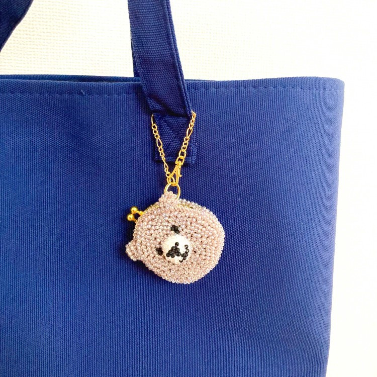 くまの顔をモチーフにしたビーズがま口バッグチャームです。かわいらしすぎないデザインが大人でも持ちやすいです。バッグに付けてお出かけすると太陽の下でビーズがキラキラ。オリジナルのハンドメイド作品で1つ1つの表情が異なります。お出かけのお供や大切な人へのプレゼントにもぜひどうぞ!