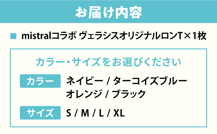 | 容量 | mistralコラボ!ヴェラシスオリジナルロンT×1枚 素材:ポリエステル100%リバーシブルメッシュ(袖口はリブ仕様) カラーサイズをお選びください。 サイズ展開:S/M/L/XL カラー展開:ネイビー/ターコイズブルー/オレンジ/ブラック |
