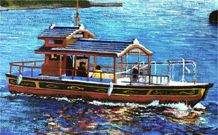 ガット船越しの浦賀水道と、穏やかな浦賀港を就航するポンポン船として親しまれている浦賀の渡しをモチーフにしたデザインです。鮮やかな光と空気をまとった瑞々しいタッチで描かれています。