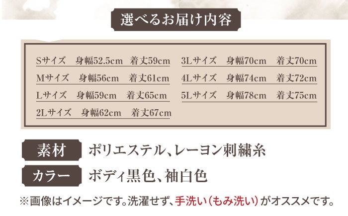 | 容量 | 【実寸】 S 身幅52.5 着丈59 M 身幅56 着丈61 L 身幅59 着丈65 2L 身幅62 着丈 67 3L 身幅70 着丈70 4L 身幅74 着丈72 5L 身幅78 着丈 75 素材:ポリエステル、レーヨン刺繍糸 カラー:ボディ黒色、袖白色 【加工地】 神奈川県横須賀市 |