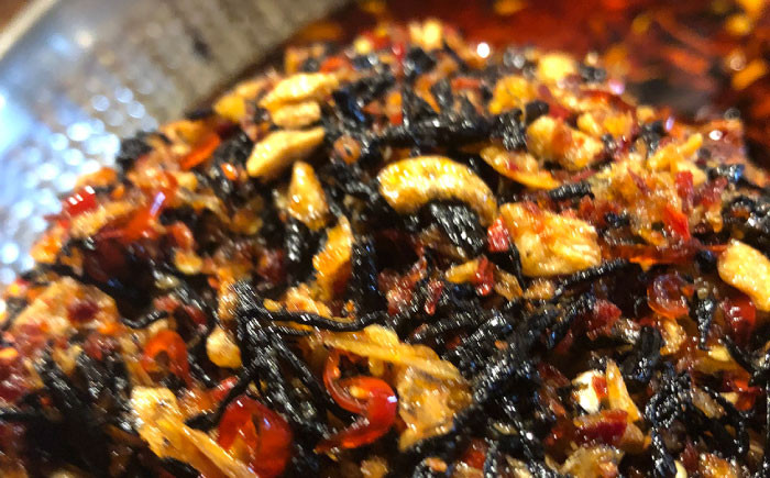 佐島平敏丸さんの朝獲れしらす干し・釜揚げひじきをふんだんに使ったラー油で、風味をラー油に封じ込めた秀逸の逸品です。