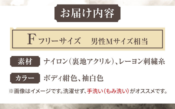 | 容量 | ■M(フリー)サイズ 実寸:着丈60cm、身幅60cm、袖丈84cm ■2Lサイズ 実寸:着丈64cm、身幅63cm、袖丈86cm 以上よりご希望のサイズをお選びください。 素材:ナイロン(裏地アクリル)、レーヨン刺繍糸 カラー:ボディ青色、袖白色 【加工地】 神奈川県横須賀市 |