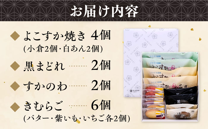 横須賀人気お土産お菓子詰め合わせ 横須賀銘菓詰合せ「衣笠」よこすか焼き(小倉・白あん)各2個 黒まどれ2個 すかのわ2個 きむらご(バター・紫芋・いちご)各2個 お菓子セット お菓子 和菓子 詰合せ【有限会社いづみや】 [AKGK011]