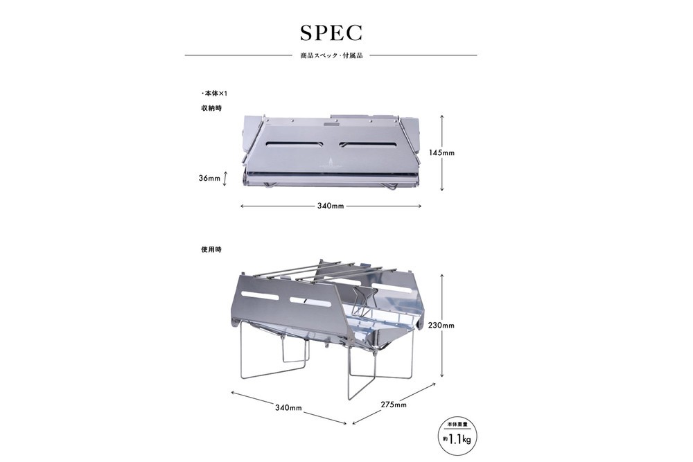 | 容量 | サイズ : 使用サイズ D272 × W340 × H235 mm / 収納サイズ D146 × W340 × H36 mm 重量 : 約1.1kg 耐荷重 : 5.0kg セット内容 : 本体 1個 / スピット型五徳 2個 / キャリーケース 1袋 |