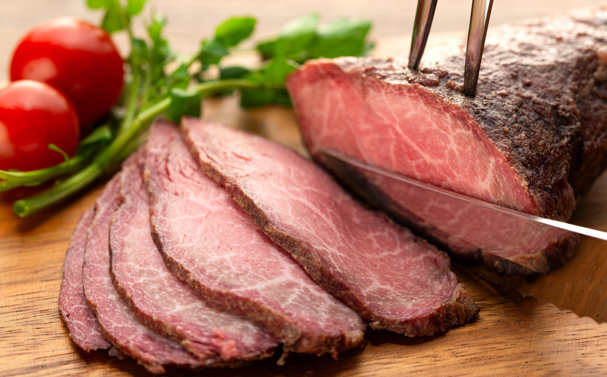 大正7年の創業以来、銘柄だけに固執せず、血統・肉質・風味を考慮し、本当においしい牛肉にこだわっている河野牛豚肉店。目利きが仕入れた牛を、ローストビーフ用に丁寧にカット。余計な味付けはせず、上質な肉の旨味が感じられる一品です。まずはスライスしてそのまま。わさびやホースラディッシュをあわせていただいても格別です。
