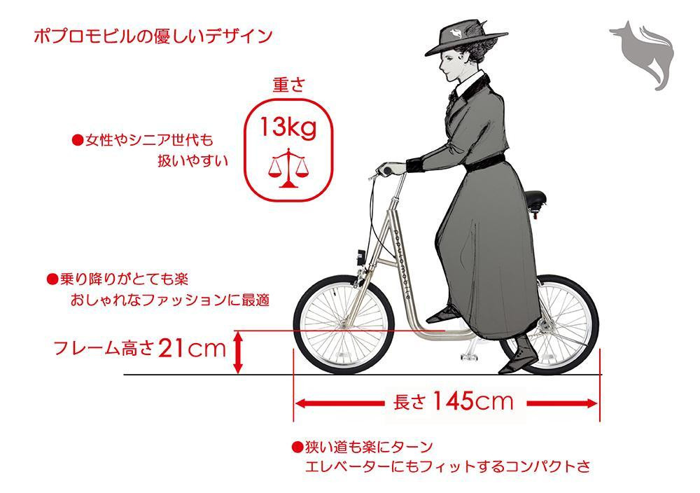 ポプロワンは、カーデザイナーがデザインしたユニークな自転車。神奈川県 鎌倉市にてオーダーメイドで組み立てています。 ●やさしいユニバーサルデザイン 最大の特徴であるU型フレームは、年齢・性別を問わず楽に乗り降りでき、街乗りにピッタリです。また低重心なので安定性が高く、安全かつキビキビした走りが楽しめます。そのコンパクトなサイズ(全長145cm)は、部屋での保管や、エレベーターでの移動、細い道でのターンなど、様々なシーンで扱いやすさを発揮。ハンドルはストレートタイプのシンプルなデザインで、スポーティなライディングポジションです。ギヤは英国スタイルのシンプルな2段変速、チェンジはペダルで行うキックシフト方式。足で直感的に操作できるので、変速時も走行への集中を妨げません。 ●本物の品質へのこだわり ポプロモビルの製品はいつまでも美しく、丈夫で長持ち。パーツの一つ一つ、そして細部までデザインと本物の品質にこだわっています。 ステンレスフレームは日本製、最新技術で生産される信頼性の高いロングライフデザインです (JIS規格テスト合格)。装着されるパーツは、日本を中心に世界から集めた逸品で構成。ハンドル、ブレーキ、ペダルなどは歴史と定評のある日本のブランド、おしゃれなサドルはイタリアから、ライトは安全性に配慮した北欧デザイン、歩行者に優しい音色のベル(シルバー色)はオーストラリアから。 ●オーダーメイドスタイル ポプロモビルではご注文を頂いてから、弊社熟練の自転車技師が心を込めて一台一台組み上げます。お客様の身長に合わせてサドルとハンドルも調整、完成車の状態で梱包してご配送いたしますので、お受取後にすぐに乗っていただくことができます。 ●美しい乗り物で豊かな生活を ポプロワンのシンプルなデザインは乗り手を引き立てます。街を颯爽と走り、乗り降りもスマート、取り回しも楽で安全。メイドインジャパンの最高品質の自転車を長く楽しみたい。そのような審美眼をお持ちのお客様に、ぜひご愛用いただきたいと思います。 ※お届けまで1ヶ月程度かかります。 【サイズ】 身長155cm~184cmまで対応いたします。 ※オーダーメイドにつき、身長などお伺いするため、注文後にメール(info@populomobile.com)またはお電話(0467-81-5403)でご連絡をいたします。