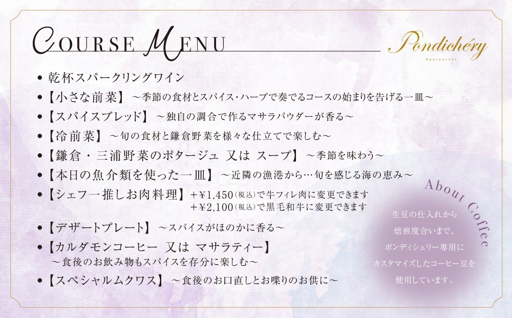 | 容量 | スパイスフレンチコース(1名分) ●乾杯スパークリングワイン(※1) ●【小さな前菜】 ~季節の食材とスパイス・ハーブで奏でるコースの始まりを告げる一皿~ ●【スパイスブレッド】 ~独自の調合で作るマサラパウダーが香る~ ●【冷前菜】 ~旬の食材と鎌倉野菜を様々な仕立てで楽しむ~ ●【鎌倉・三浦野菜のポタージュ 又は スープ】 ~季節を味わう~ ●【本日の魚介類を使った一皿】 ~近隣の漁港から… 旬を感じる海の恵み~ ●【シェフ一推しお肉料理】 +¥1,450(税込)で牛フィレ肉に変更できます(※2) +¥2,100(税込)で黒毛和牛に変更できます(※2) ●【デザートプレート】 ~スパイスがほのかに香る~ ●【カルダモンコーヒー 又は マサラティー】 ~食後のお飲み物もスパイスを存分に楽しむ~ (生豆の仕入れから焙煎度合いまで、ポンディシェリー専用にカスタマイズしたコーヒー豆を使用しています) ●【スペシャルムクワス】 ~食後のお口直しとお喋りのお供に~ (※1)乾杯のスパークリングワイン以外のドリンクをご注文される場合、本寄附とは別に現地でのお支払いが必要です。 (※2)【シェフ一推しお肉料理】で牛フィレ肉、または黒毛和牛へ変更される場合、本寄附とは別に現地でのお支払いが必要です。 |