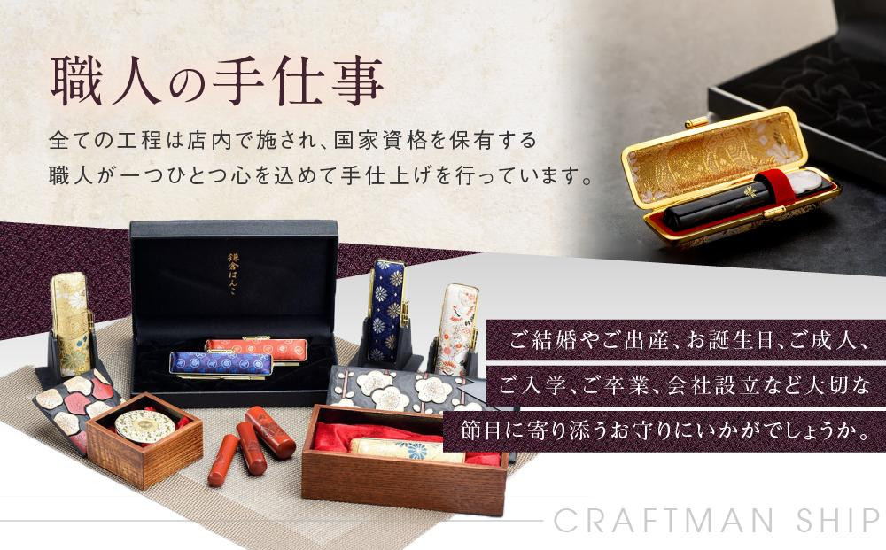(鎌倉はんこ)鎌倉ゆかりの縁起の良い吉相印鑑「鎌倉彫り印鑑…210,000 円 ご結婚やお子様が産まれた時、お誕生日、成人、ご入学、ご卒業などの機会のプレゼントにも喜ばれています。 鎌倉はんこは歴史ある鎌倉で作る特別な印鑑となります。 厳選された天然牙、角、銘木を中心に取り揃え、鎌倉を代表する神社で祈祷した印材で、お名前の画数から印面を作成させていただき、最も相応しい吉相印をお作りいたします。 鎌倉はんこは、全ての作業工程を店内で行い1本1本、心を込めて手仕上げしています。 かまくら推奨品 全国観光土産品連盟推奨品 神奈川県推奨観光土産品 鎌倉市ふるさと納税返礼品 鎌倉市観光協会 鎌倉セレクション掲載店 鶴岡八幡宮 槐の会 法人会員 象牙印鑑の環境省・経済産業省認定店 公益社団法人 全日本印章業協会 加盟店 鎌倉市観光協会 加盟店 鎌倉市商工会議所 加盟店 鎌倉市御成商店街協同組合 加盟店 国家検定 印章彫刻技能士 資格保有 創業70年 30000本以上の彫刻実績 伝統工芸品の「鎌倉彫」の印鑑は、50年かけて育った薩摩地方の柘植の木を印材に加工し、その後、鎌倉彫職人が丁寧に絵柄を彫りあげ、何層にも分けて塗りを行います。乾口(ひくち)塗りは、使えば使うほど年数が経てば立つほど、艶やかな風合いになるのが特徴。仕上がるまでにおよそ4カ月の期間を要します。中世の時代から脈々と受け継ぐ鎌倉彫の技術と印鑑が組み合わさった伝統工芸品です。鎌倉彫のツタの絵柄は、13.5ミリはツタ紋様1つ、15ミリはツタ紋様2つ、18ミリはツタ紋様3つとなります。更に当店で、その鎌倉彫印鑑を、姓名鑑定「月乃吉相印」として、あなたのお名前を丁寧に一本一本彫刻いたします。鎌倉が誇る最高傑作の縁起の良い印鑑に仕上がります。また、当店オリジナルの工芸のケースも縁起紋様で一つ一つを印鑑ケース職人が手作りしたものになります。 印章文化伝播の地である鎌倉で、日本古来から伝わる工法で作られた縁起良いのこだわり印鑑。 当店の印鑑は、鎌倉を代表する神社で祈祷を行い、お客様の姓名の画数から八方位学を用い印面を作成し、字入れ、彫刻、押印、鑑定書作成をすべて店内で一貫して作業いたします。 お子様、お孫様が生まれた時、成人される時、ご結婚される時、住宅・車の契約時などの贈り物としてもお喜び頂いております。 - 常温便