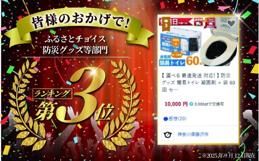 チョイスPayポイントと交換できる品 60回分大容量!10年長期保存 防災用非常トイレ コンパクトで備蓄用に最適! 【 選べる 最速発送 対応! 】 防災グッズ 簡易トイレ 凝固剤 + 袋 60回 セット 10年長期保存 収納簡単 非常用 防災用品 防災 グッズ スマートトイレ 非常用トイレ トイレ といれ 災害 対策 備蓄 避難 介護 グッズ 地震 台風 日用品 アウトドア キャンプ 長期保存 フジトレーディング 神奈川 湘南 藤沢