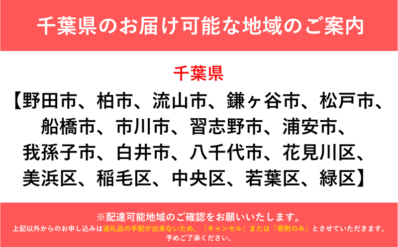 入金確認後、準備でき次第発送いたします。 【配送可能エリア】 東京都、神奈川県、埼玉県の全域および千葉県の一部地域 ※千葉県配送可能地域 【野田市、柏市、流山市、鎌ヶ谷市、松戸市、船橋市、市川市、習志野市、浦安市、我孫子市、白井市、八千代市、花見川区、美浜区、稲毛区、中央区、若葉区、緑区】 ※上記のエリア以外からの申し込みは返礼品の手配が出来ないため、「キャンセル」または「寄附のみ」とさせていただきます。 |