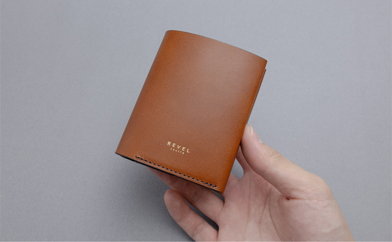 コンパクト二つ折り財布ENOUGHは、財布の端の部分の縫い目を無くした折革技法で設計したことで紙幣も出し入れし易いまま小型化しています。
