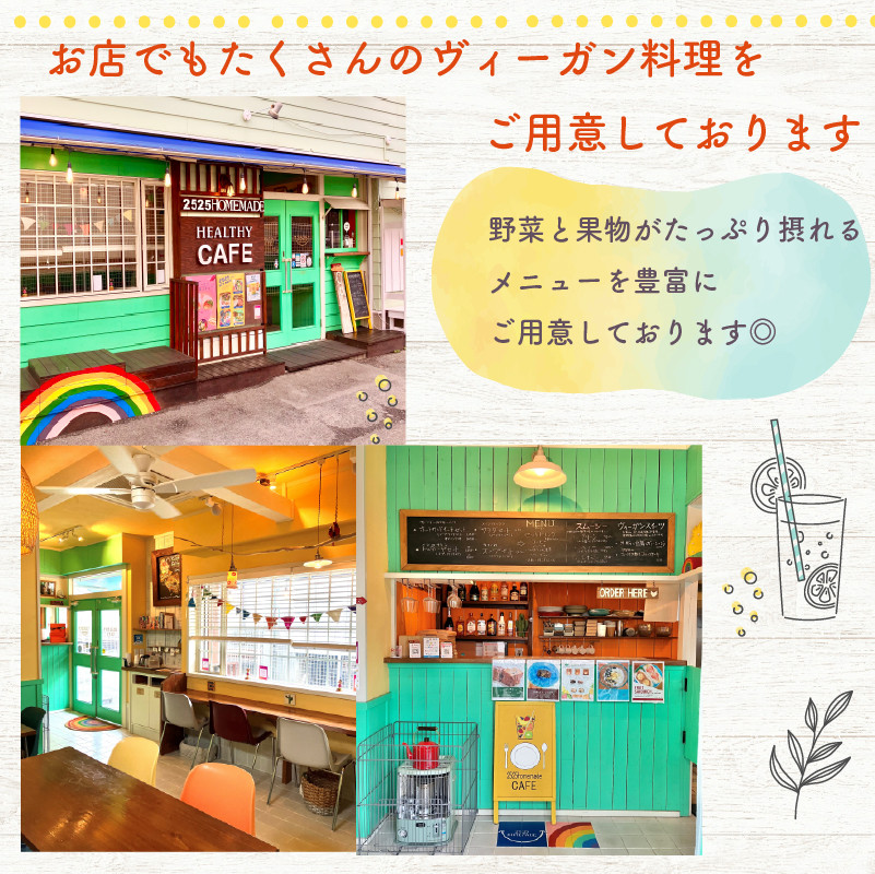 海岸近くにある美味しいヴィーガンスイーツとベジタリアンフードが人気の「ヘルシーカフェ2525(ニコニコ)HOMEMADE」から、手土産やギフトに喜ばれている自家製グラノーラ4袋と食べやすく棒状にしたグラノーラバー7本をセットにしてお届けいたします。