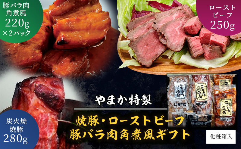 ローストビーフ焼豚豚バラ肉角煮風ギフトセット焼き豚煮豚炭火焼チャーシュー豚の角煮お肉にくおつまみおかずお惣菜お取り寄せギフトプレゼントお歳暮贈り物やまか特製叉焼化粧箱入り株式会社やまか