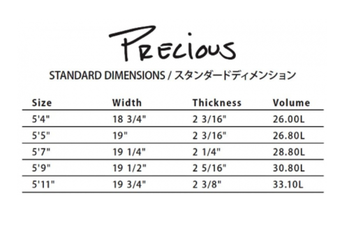 容量 | PRECIUS 5FIN FCS2 お申し込みの際に備考欄にご希望のサイズをご記入ください。 サイズ(5'4"、5'5"、5'7"、5'9"、5'11") ※詳細は画像のサイズ表をご参照ください。 |