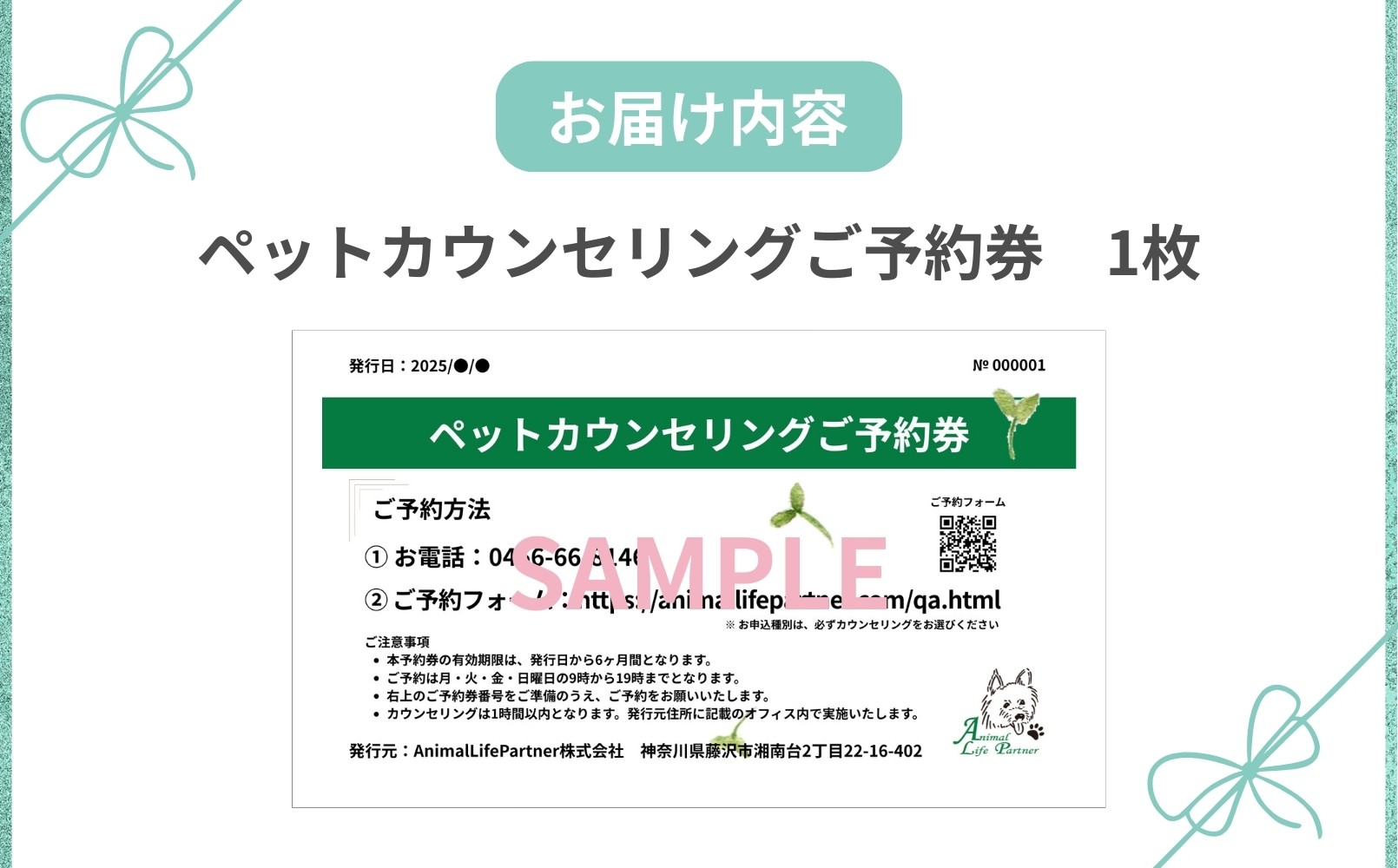 ペットカウンセリング 60分予約券 動物 ペット ぺっと 飼育 しつけ 獣医 カウンセリング かうんせりんぐ 悩み 相談 ケア オーダーメイド アドバイス 犬 いぬ 猫 ねこ ウサギ うさぎ ハムスター はむすたー アニマルライフパートナー株式会社 神奈川 湘南 藤沢