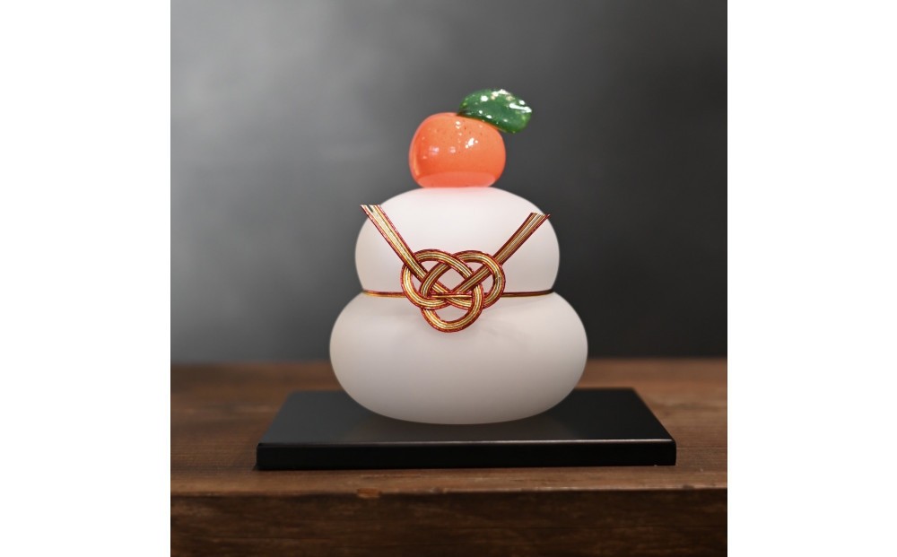 お餅の部分はすりガラス加工をし、ガ ラスではないかのような、優しく柔らかな印象。みかん(橙)は代々繁栄する事を願い少し大きめに、飾り結びは水引を使い、可愛らしさ満点に仕上げました。