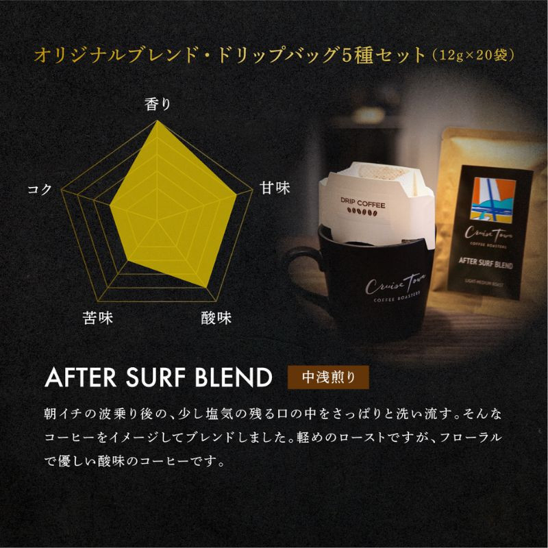 | 容量 | [オリジナルブレンド・ドリップバッグ5種セット] ・CRUISE TOWN BLEND ドリップバッグ(中深煎り)12g×4袋 ・AFTER SURF BLEND ドリップバッグ(中浅煎り)12g×4袋 ・TANAHOLIC BLEND ドリップバッグ(深煎り)12g×4袋 ・SHONAN SUNSET BLEND ドリップバッグ(浅煎り)12g×4袋 ・CLIMBER, CLIMBER. BLEND ドリップバッグ(中深煎り)12g×4袋 計20袋 ※CLIMBER, CLIMBER. BLENDは、サマーブレンドとウィンターブレンドがあり、季節に応じて入れ替わります。 |