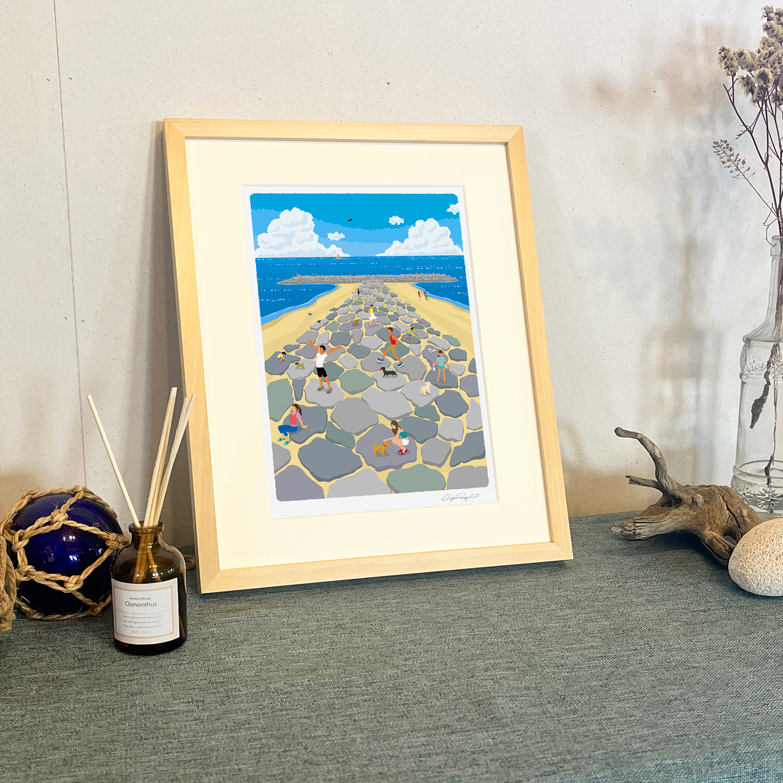 湘南・茅ヶ崎で描く、海を感じるイラストアート 『 湘南ランドスケープ03:茅ヶ崎 ヘッドランド 』 ジークレーアートフレーム (小)/絵画 風景 版画