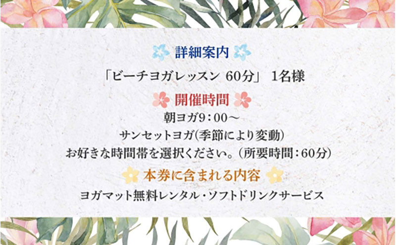 | 容量 | ビーチヨガ体験レッスン 60分 1名様 朝ヨガ9時~/季節により変動の中よりお好きな時間帯を選択ください。所要時間60分、ヨガマット無料レンタル、1ドリンクサービス付き |