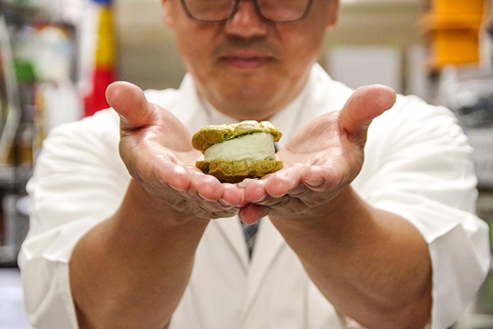 シュー皮とアイスの鮮やかなグリ ーンは 日本料理の伝統技法である「青寄せ」という丁寧な手仕事で抽出されます。