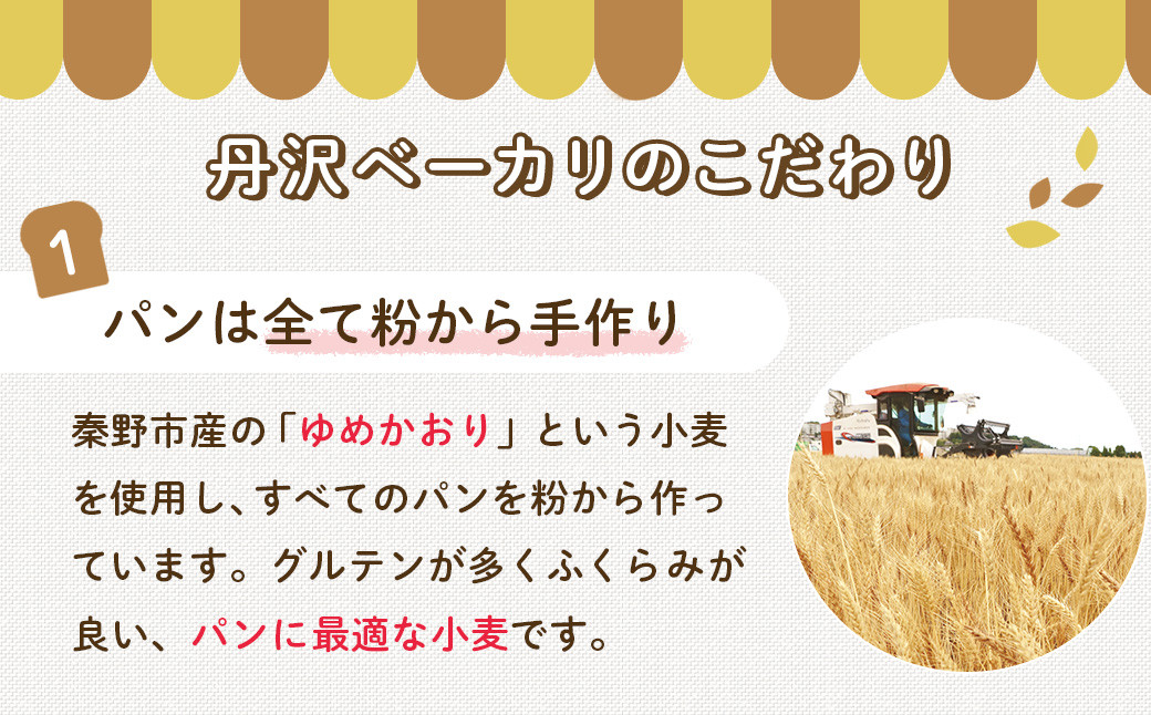 小麦は秦野市産ゆめかおり、水は秦野のおいしい水を使い、すべてのパンを粉から作っています。食パンやクロワッサンなど6~8種類のパンをバランスよく詰めてお届けします。