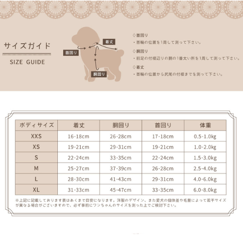 | 容量 | ドッグウェア「VIVIANA」くま柄ロンパース 1着 サイズは備考欄へご記入ください。 サイズ展開 XS/S/M/L/XL サイズガイド サイズ 着丈 胴回り 首回り 体重 XS 19-21㎝ 29-31㎝ 19-21㎝ 1.0-2.0kg S 22-24㎝ 33-35㎝ 22-24㎝ 1.5-3.0 kg M 25-27㎝ 37-39㎝ 26-28㎝ 2.5-4.0 kg L 28-30㎝ 41-43㎝ 29-31㎝ 4.0-6.0 kg XL 31-33㎝ 45-47㎝ 33-35㎝ 6.0-8.0 kg ※上記に記載しております表はあくまで目安になります。洋服のデザイン、また愛犬の個体差や毛量によって若干サイズが異なる場合がございますので、 必ず事前にワンちゃんのサイズを測った上でご検討下さい。 |