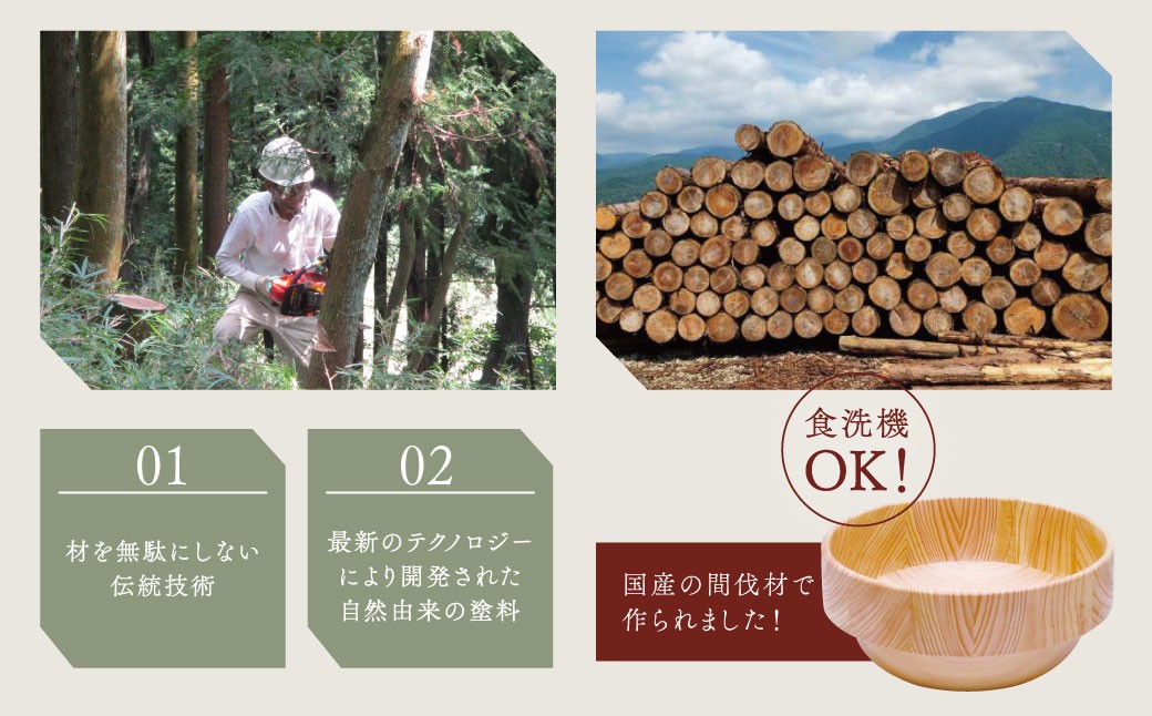 国産の間伐材で作られた「寄木DON」シリーズは平安時代から伝わる材を無駄にしない伝統技術と最新のテクノロジーにより開発された自然由来の塗料により「食洗機対応」という利点を併せ持ったまさに地産地消・サステナブルの精神がギュッと詰め込まれた器です。