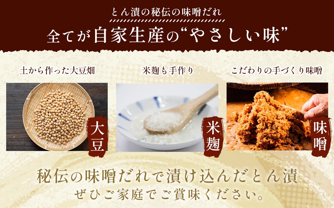 あつぎ豚臼井のとん漬 【当店の厚木名産とん漬は大豆も味噌も豚肉もすべて厚木で自家生産して作りあげています。豚肉は厚木の地で養豚一筋50余年の歴史の中でやっとたどり着いた極上の豚、あつぎ豚。かながわブランドにも認定されています。味噌は大豆から栽培し手前味噌を作り、特製のとん漬味噌を作りました。また塩麹も米から栽培し麹菌を植え付け米麹を作り、特製の塩麹に仕上げました。】 厚木市内において、厚木市産の原材料(豚肉)を100%使用し、製造、加工、サービスの提供を行っております。 発送予定期間:入金確認から18日~32日 本返礼品の主要な部分は、厚木市にて生産、製造または加工したものが占めております。