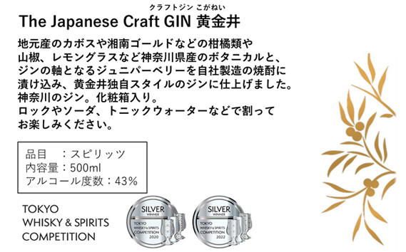 自社製造の焼酎をベースに、カボスや山椒など神奈川県産のボタニカルとジンの軸となるジュニパーベリーを風味原料として使用し、爽やかに香る黄金井独自スタイルのジンに仕上げました。ロックやソーダ、トニックウォーターなどで割ってお楽しみください。