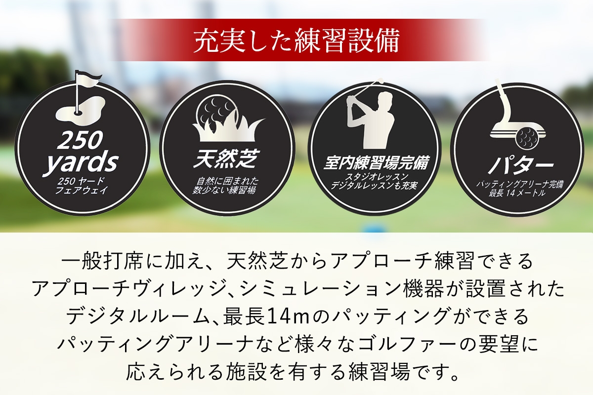 一般打席に加え、開放感あふれる青空ガーデンや天然芝からアプローチ練習できるアプローチヴィレッジ、本格的なシミュレーション機器SDRが設置されているデジタルルーム、最長14mのパッティングができるパッティングアリーナなど、様々なゴルファーの要望に応えられる施設を有する練習場です。