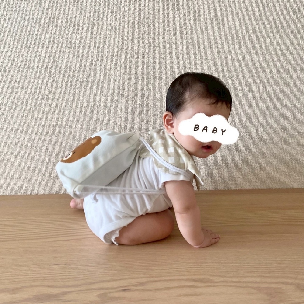 ※写真のモデルは生後7ヶ月の男の子 (体重8kgから9kg) になります。紐を通すことができる方は、きつくなってきたら長い紐に付け替えるのもおすすめです。