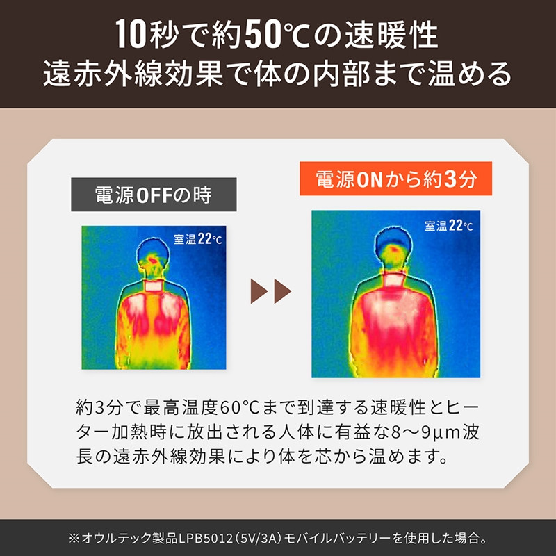 約3分で最高温度60℃まで到達する速暖性とヒーター加熱時に放出される人体に有益な8~9μm波長の遠赤外線効果により身体を芯から温めます。