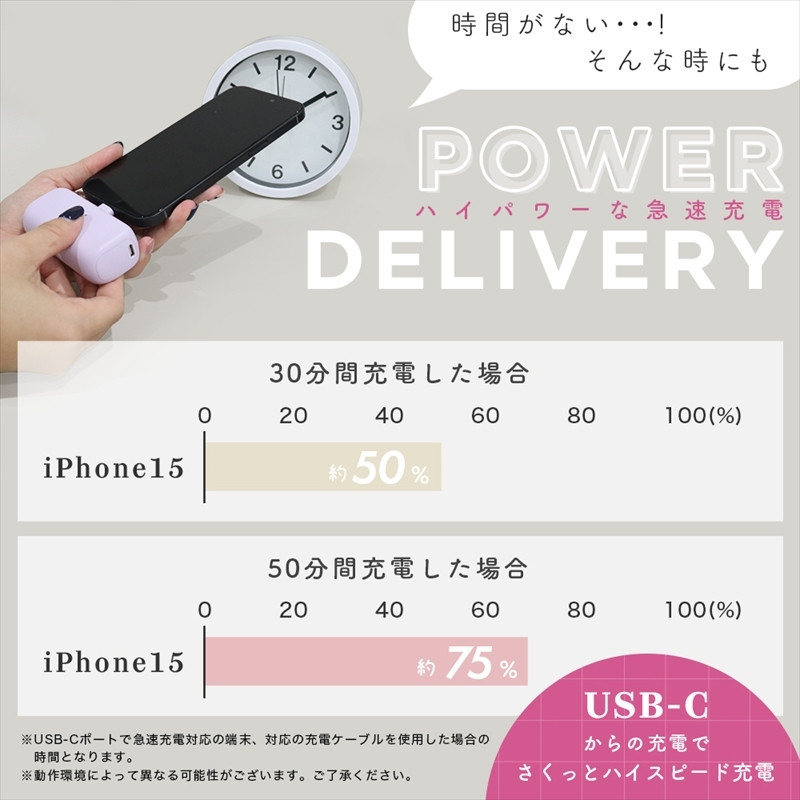 ケーブル不要で直接挿して充電できる、USB-Cコネクタが一体になったモバイルバッテリーです。