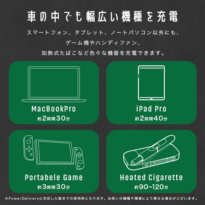 スマホ、タブレットはもちろん、ノートパソコンまで車で急速充電できる車載用の充電器です。