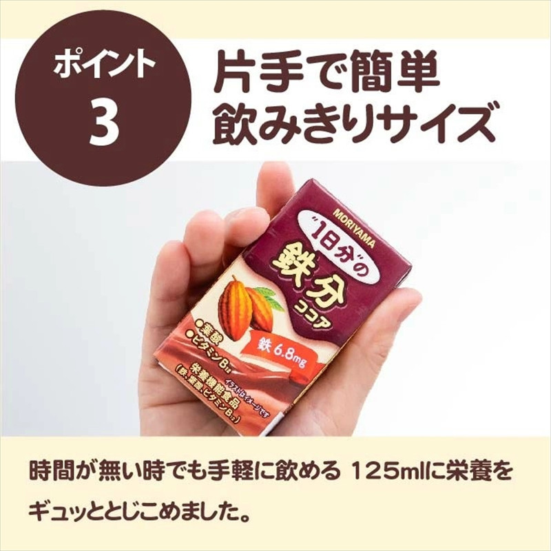 「美味しく1日1本栄養チャージ」をコンセプトとした美味しさにこだわったドリンクです。 不足しがちな1日分の鉄6.8mgとその吸収を促進するビタミンB12と葉酸を1本で摂取できます。 鉄の独特の風味をカカオ100%ココアと組み合わせて、味わい深い濃厚な美味しさが楽しめる一品に仕上げました。 時間がない時でも手軽に飲める125mlの飲みきりサイズです。 本商品は相模女子大学と守山乳業の共同取り組み商品です。 【産地・原材料名】 砂糖(外国製造)、ココアパウダー、脱脂粉乳、植物油脂、果糖、カカオマス、乳糖、デキストリン、食塩/乳化剤、安定剤(セルロース)、香料、硫酸鉄、葉酸、ビタミンB12 【使用方法】 付属のストローでお召し上がりください。 【保存方法】 常温保存(未開封時) 【賞味期限】 上部シール部に記載 【注意事項】 お受け取り後、賞味期限をご確認ください。 乳成分を含みますので、アレルギーをお持ちの方はご遠慮ください。 開封後は10℃以下に保存して賞味期限にかかわらずお早めにお召し上がりください。