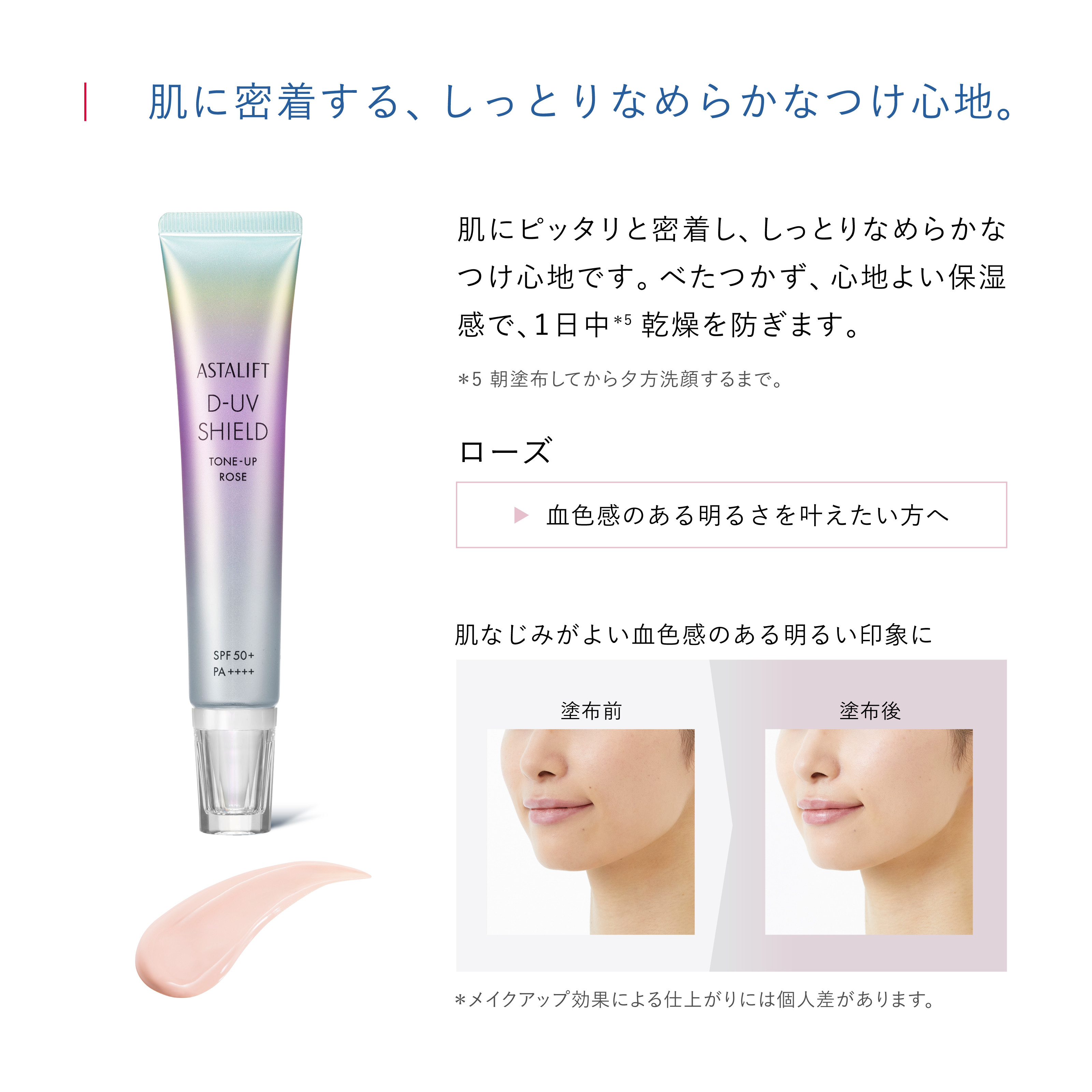 知らない間に肌の奥深くまで到達してしまう「Deep紫外線」をカット(*1)し、日焼けによるシミを予防。くすんだ肌の色を明るくみせるトーンアップ効果(*2)により、くすまず、白浮きしにくい自然な肌の明るさを実現します。また、肌の動きに合わせてフィットし、くずれにくい紫外線防御膜により乾燥から肌を守り、1日中(*3)肌のうるおいが続きます。