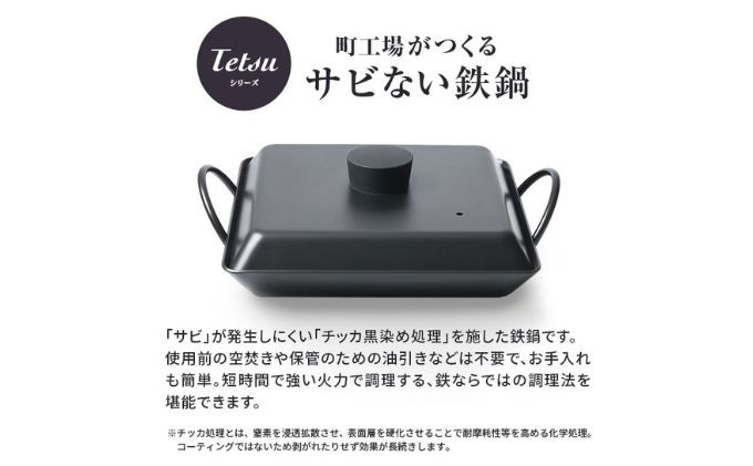 「鉄鍋はサビる」という常識を覆す、窒化黒染め処理を施した鉄角鍋に、蓋セットが誕生しました。