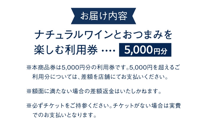 | 容量 | ・ナチュラルワインとおつまみを楽しむ利用券 5,000円分 ※本商品券は5,000円分の利用券です。 5,000円を超えるご利用分については、差額を店舗にてお支払いください。 ※額面に満たない場合の差額返金はいたしかねます。 |
