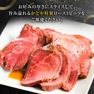 厳選した国産牛モモ肉を使用した上質なローストビーフです。約350g(3~4人前)のブロックをお届け致します。ブロックでのお届けとなりますので、お好みの厚さにスライスして、旨み溢れる「かどや特製」ローストビーフをご堪能ください。