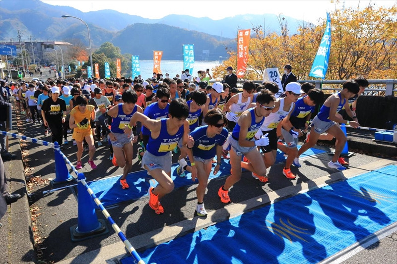 丹沢湖の完成を記念して昭和54年(1979年)に始められた大会です。毎年11月の開催時期にはちょうど紅葉が見ごろを迎え、湖の周りの山々はきれいな紅葉に染まります。