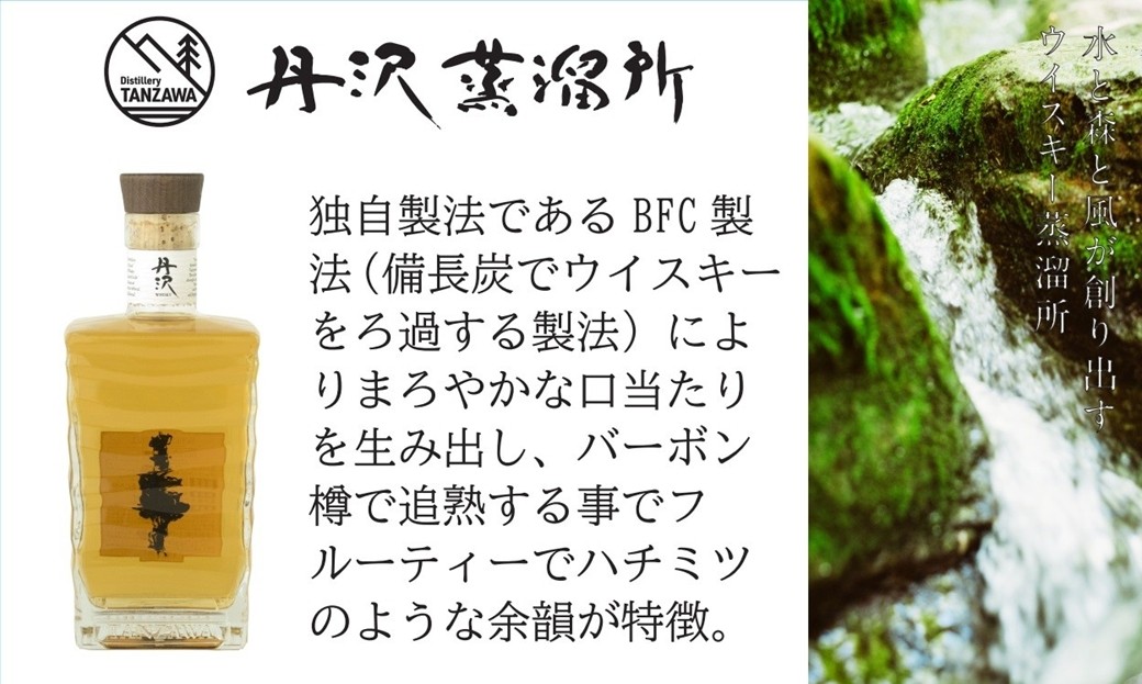 本場スコットランド原酒(モルト・グレーン)を、独自の製法で口当たりの良いまろやかなすっきりとしたウイスキーに変化をさせ、厳選された樽に入れて、一定期間熟成をした後、丹沢の大自然から湧き出た天然水で加水を行い、丸みのあるまろやかな口触りとメイプルシロップのような気品ある甘い香りが優しく広がるウイスキーに仕上げました。