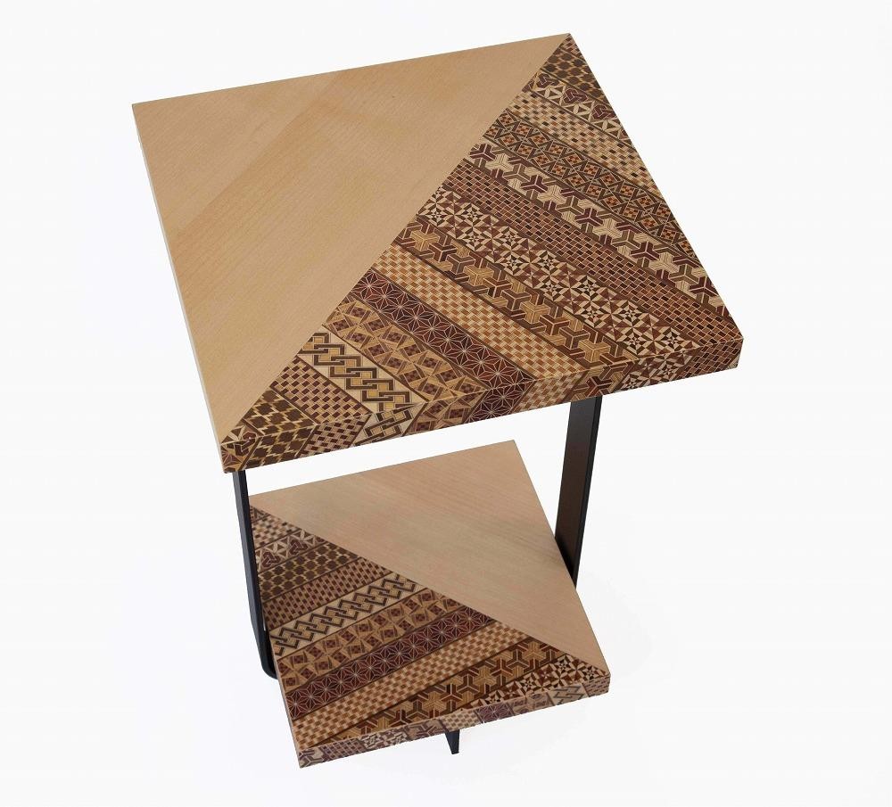 日本の伝統工芸、箱根寄木細工をモダンな実用品にアップデートし、特注のアイアンレッグを使ってスタイリッシュなデザインのミニテーブルにしました。