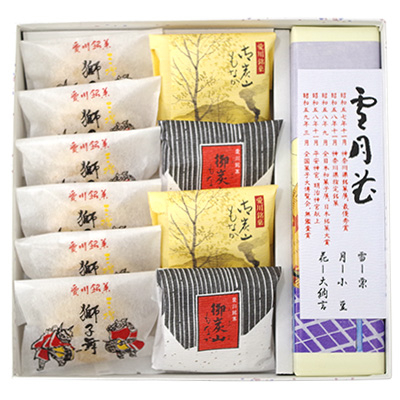 全日本和菓子展において日本銘菓大賞に輝いた神奈川県指定銘菓にも認定されている羊羹 雪月花。充分に吟味した北海道産の小豆を使い、きざみ栗を加えたつぶ餡を、しっかりとした手焼きの最中種で包んだ風味豊かな味わいの御炭山最中。愛川町の「重要無形文化財 三増獅子舞」を銘菓にと創作した優しい味わいの焼菓子 獅子舞。愛川ブランドに認定された御炭山最中と獅子舞、神奈川県の指定銘菓に認定されている羊羹の入った詰め合わせです。