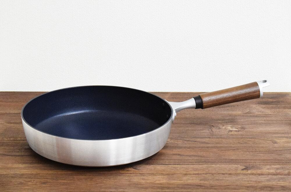 「広い・深い・軽い」新しい形のフライパン。側面を薄く底厚形状を2段にして軽量化。強度が高いマグネシウム合金を使用しているので薄くても丈夫に造られています。