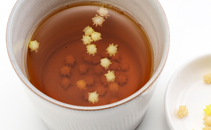 明治33年から作られている、金平糖のようで金平糖ではない、あられを使った新潟の伝統菓子です。そのまま食べるのもおいしいですが、飲み物に浮かべると砂糖が溶けてあられがプカプカ浮かんでくるのが特徴です。