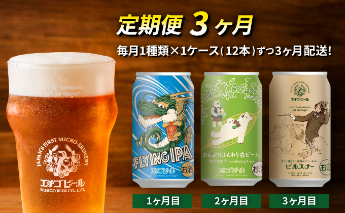 【定期便3ヶ月】エチゴビール【1ヶ月目】FLYING IPA350ml缶×12本【2ヶ月目】のんびりふんわり白ビール350ml缶×12本【3ヶ月目】ピルスナー350ml缶×12本 ビール 全国第一号 クラフトビール 350ml 12本 酒 定期便 3回 お楽しみ