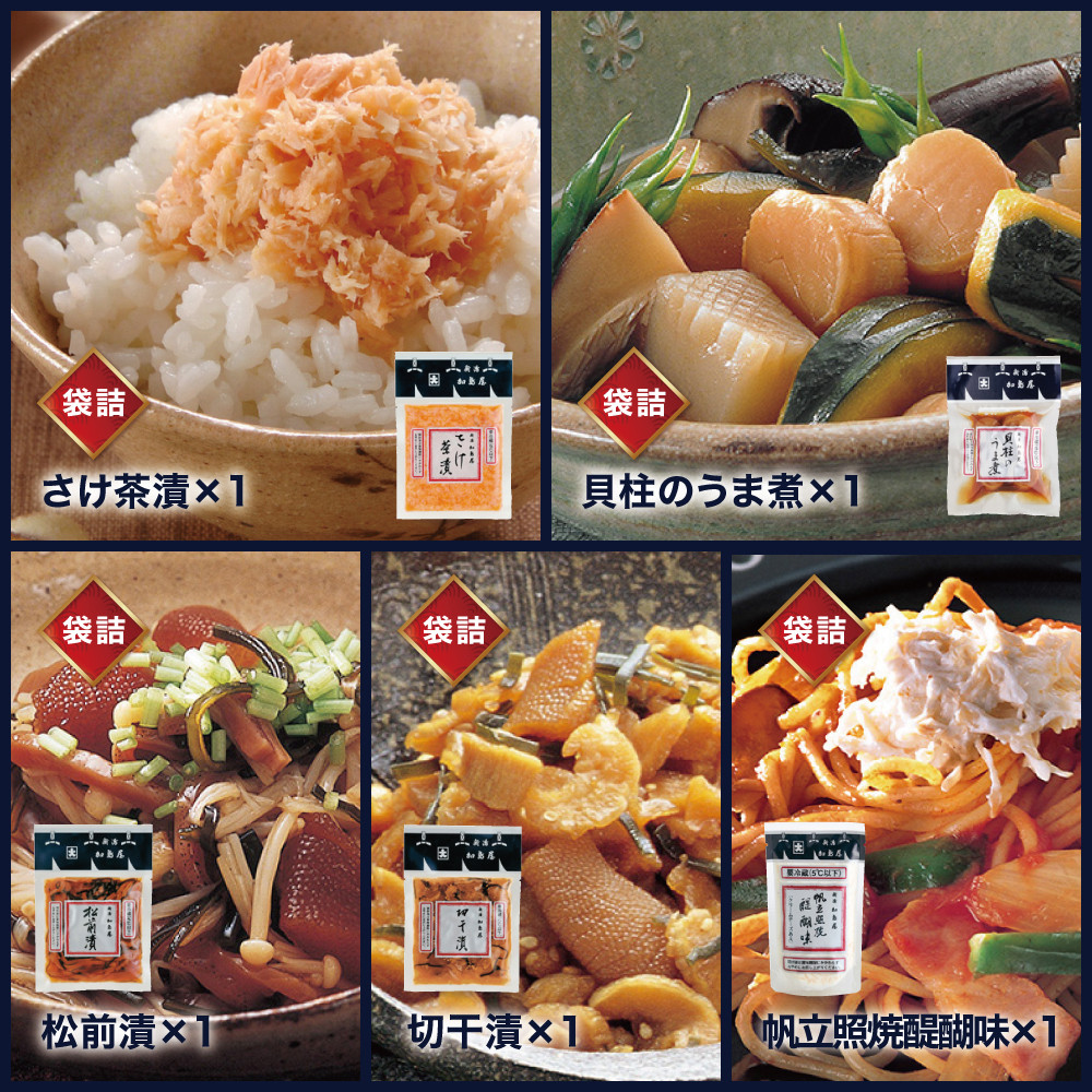 加島屋の味覚 袋詰5枚セット さけ茶漬 貝柱のうま煮 帆立照焼醍醐味 切干漬 松前漬 つまみ おつまみ お茶漬け ごはんのお供 ご飯のお供 鮭ほぐし 鮭 鮭フレーク サケ ホタテ ほたて 帆立 瓶詰 新潟