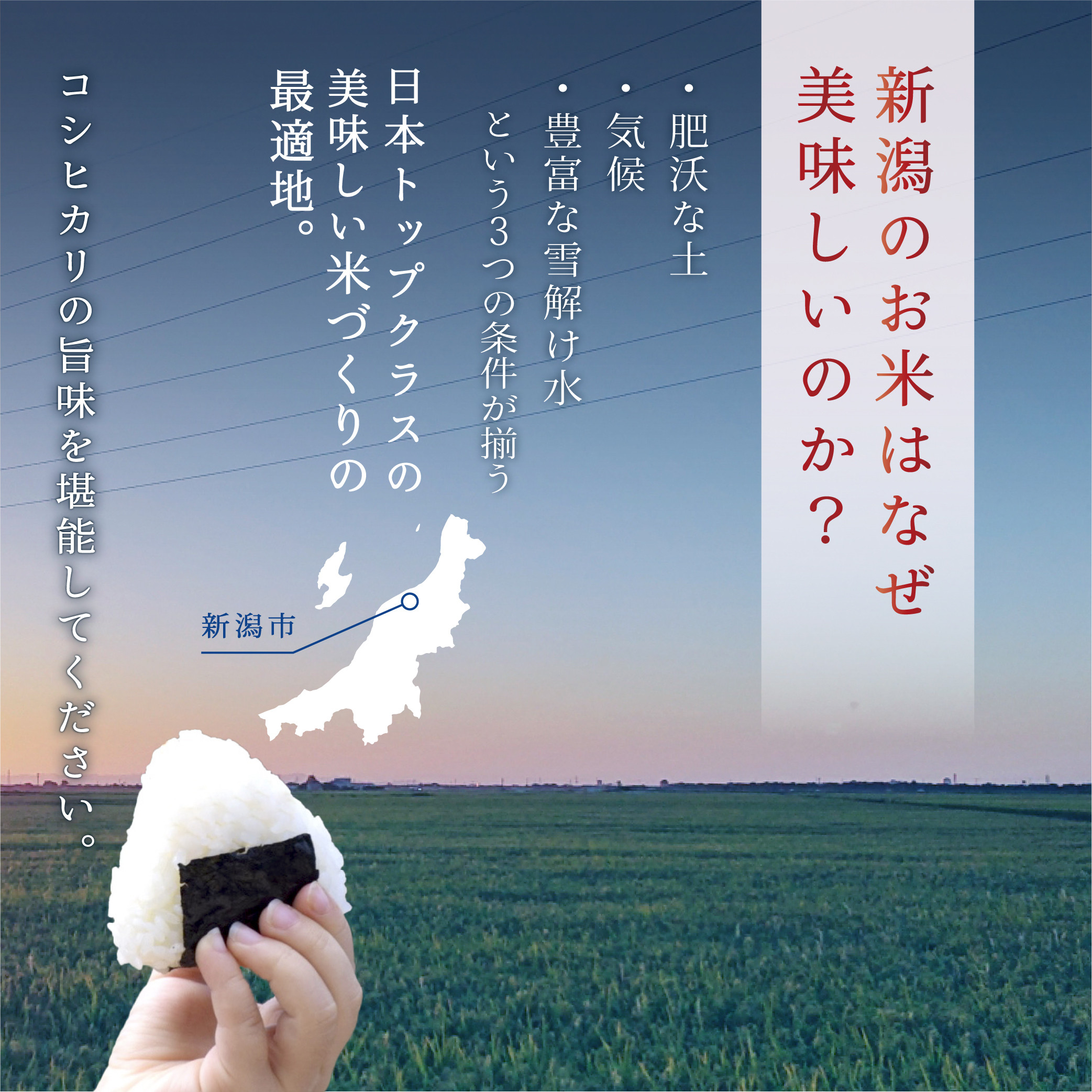 広大な越後平野は信濃川や阿賀野川などの大河川が上流から栄養を豊富に含んだ肥沃な「土壌」、登熟期の適温そして、この時期の昼夜の温度差が大きい「気象条件」、雪国新潟の「雪解け水」は山林の落ち葉が作り上げた腐葉土の養分をたくさん含んで川へ流れ出し春には農業用水として活用されます。コシヒカリの稲作環境における自然条件が新潟のお米をより美味しくしています。独特の甘みと粘り、炊き上がりの香りと艶やかさ。新潟米の定番 「新潟産コシヒカリ」です。